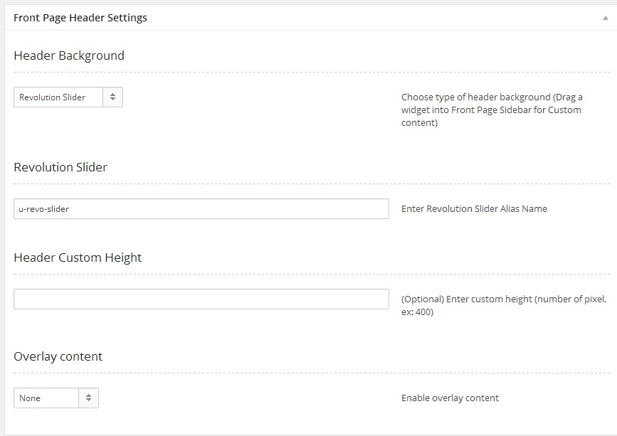 Configure Header in Front Page Header Setting box. Choose the attributes as below